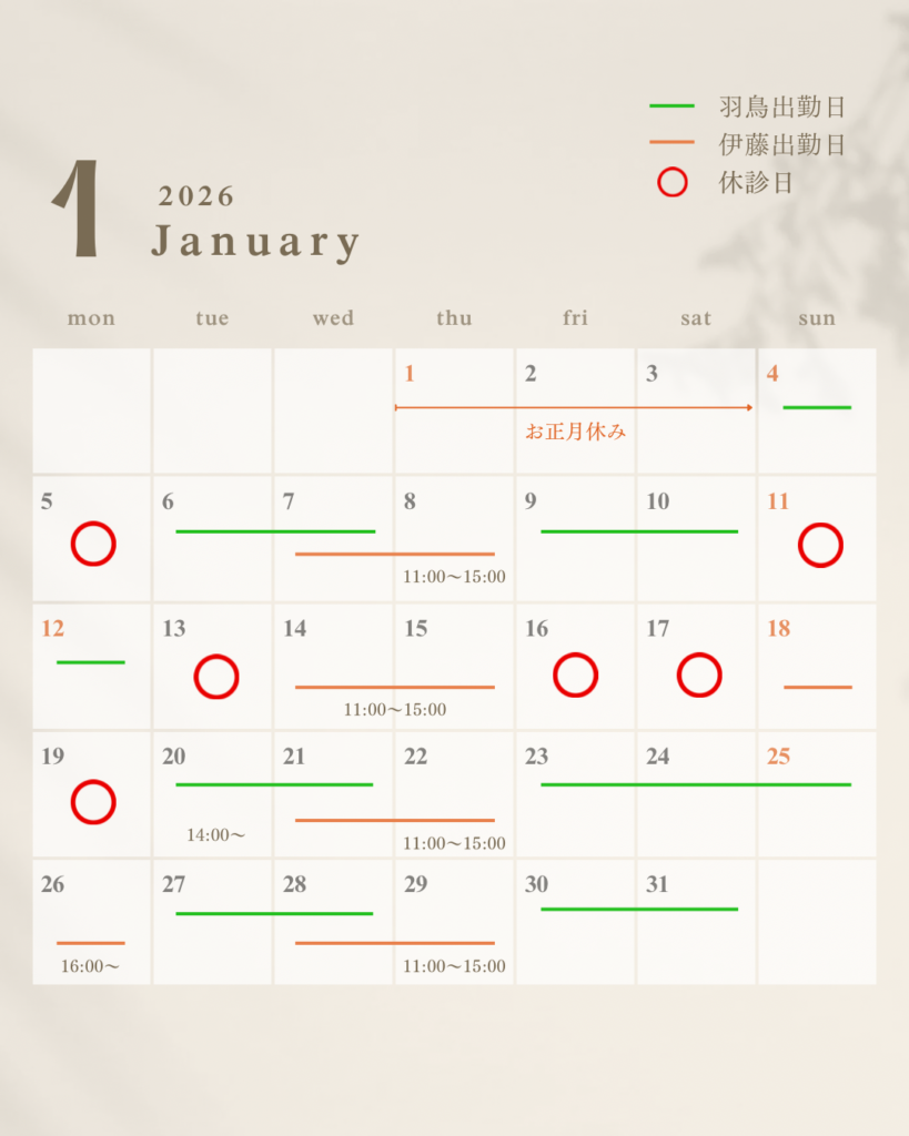 12/20(土)11:00より1月のご予約が始まります。 ご予約ご希望の方は以下を参考にご予約ください😊 【休診日】 14日(水)〜18日(日)まで体操競技U-20代表合宿帯同のため休診日が多くなっております。 1日(木)〜3日(土) 5日(月) 11日(日) 13日(火) 16日(金) 17... ご予約について